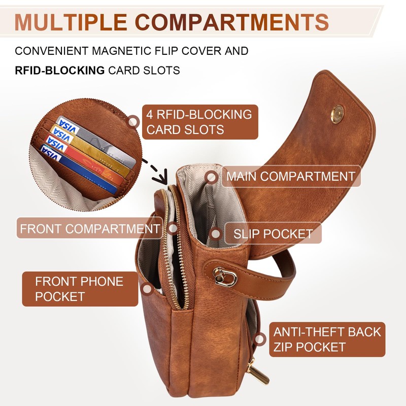 - SPACIOUS & ORGANIZED: Holds phone/wallet/essentials in 4 zones - front phone pocket, front zip pocket (includes 4 card slots), main compartment (includes a slip pocket) and anti-theft rear pocket. Carry more, stay light