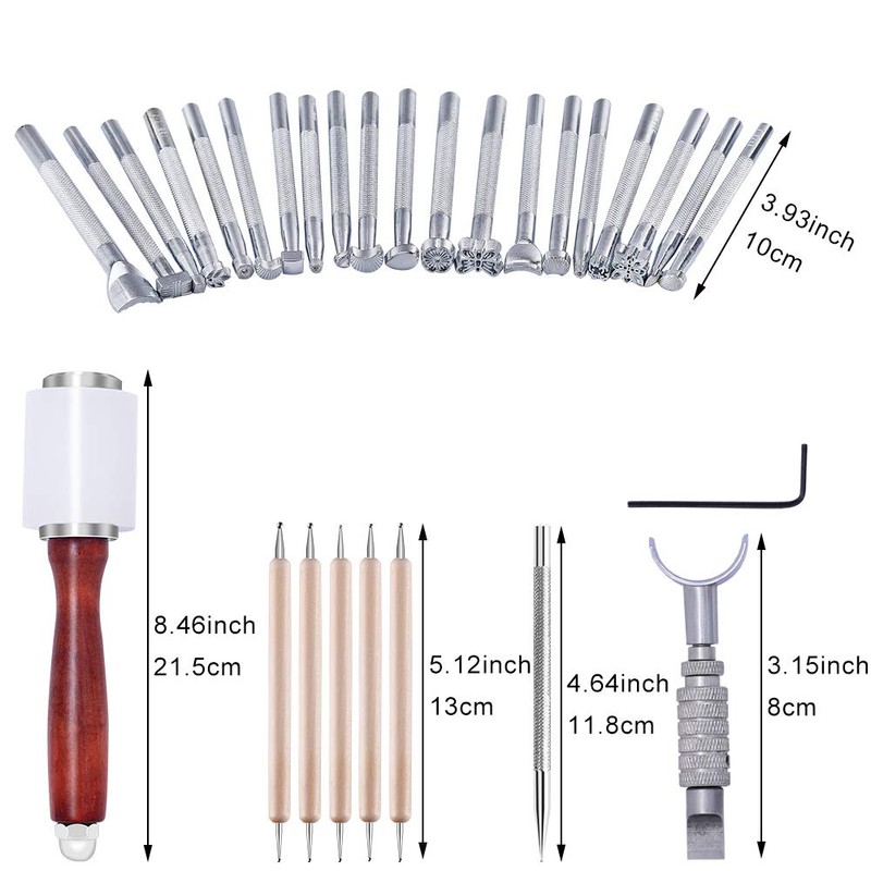 - ✅Leather Crafting Tools Kit -- Our leather carving stamps tools kit including 20 piece special shape stamp tools, leather carving hammer , stainless steel swivel knife, leather burning tool and 5 piece tracing pen. Suitable for beginner and professional craft man.