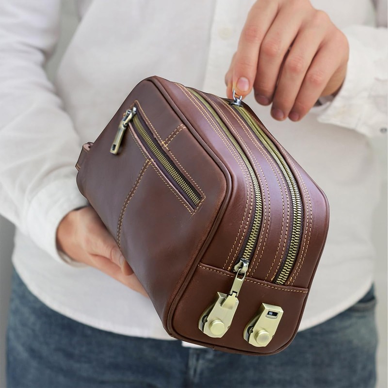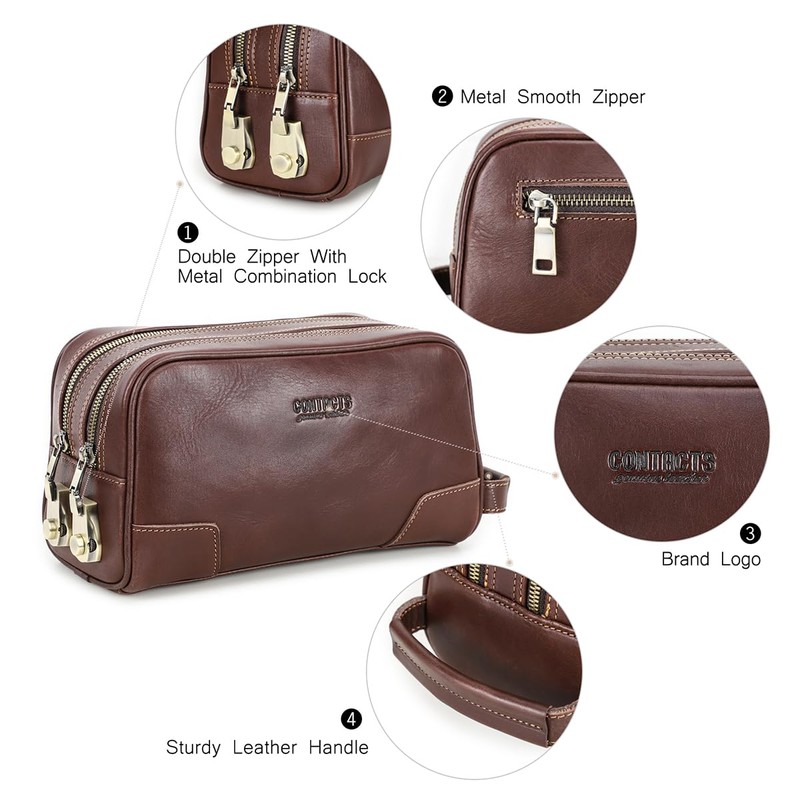 - DOUBLE ZIPPER HANDBAG - Large leather mens clutch purse comes with 2 main zip pockets, 1 compartment pocket, 1 inside zip pouch and 1 back zipper pocket, you can hold cell phone, checkbook, passport, perfume, razor and more in this mens bag