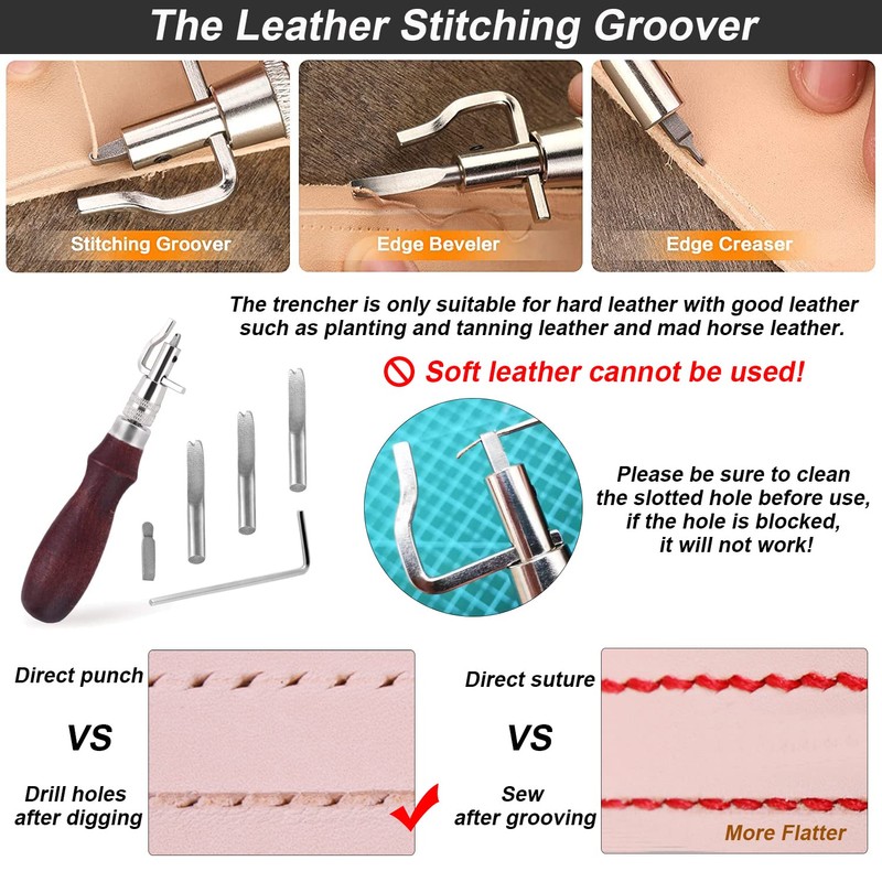 - 【Easy operation】Lightweight and durable, has reasonable design, is easy to install and easy to hold. The edge of the knife head is sharp and labor-saving. Adjustable leather edge stitching tool can easily achieve an ideal effect. For scratching, trimming and digging grooves for vegetable tanned leather.