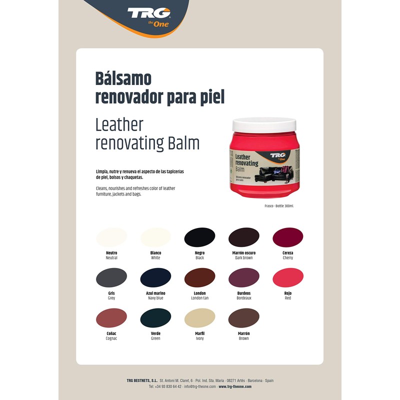 - TRG Leather Renovating Balm is sold in a range of 14 colors, each color specifically formulated for application on a wide range of leather, from a light to a darker shade of the same color. Find the color that most closely matches your leather item