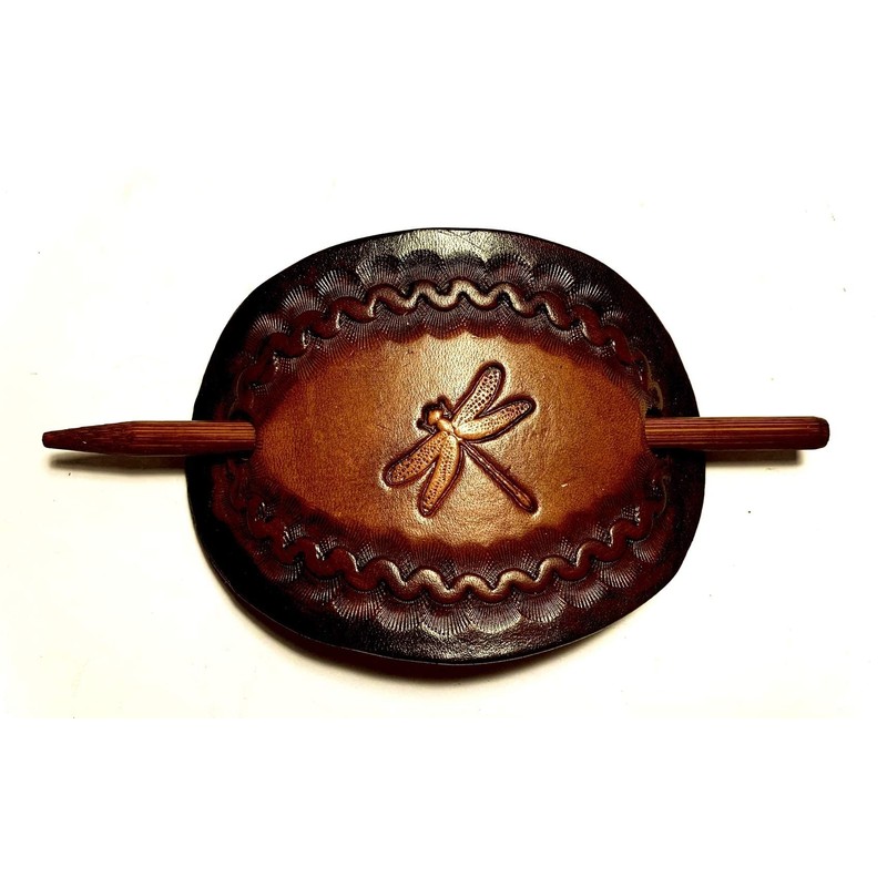 LEATHER STICK BARRETTE, HAIR BARRETTE, PONYTAIL HOLDER, HAIR CLIP, HAIR ACCESSORIES, PONYTAIL CLIPS, DRAGON FLY ON MED BROWN, DARK BROWN EDGE