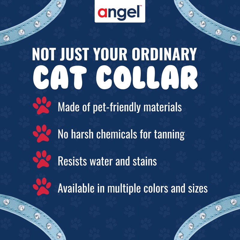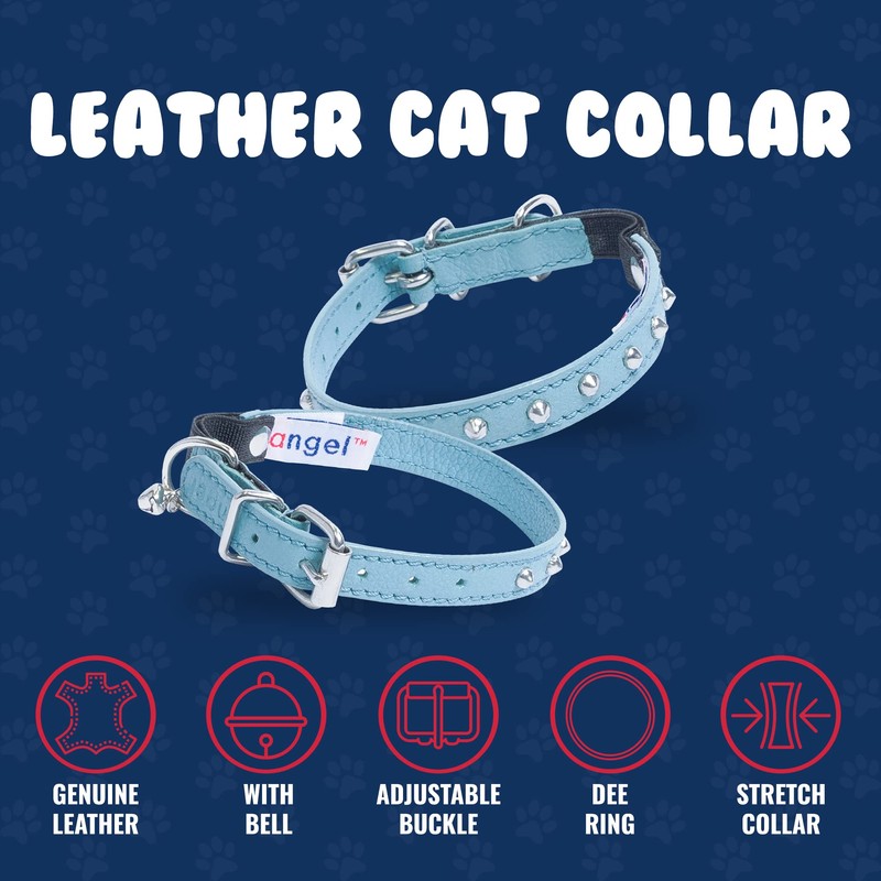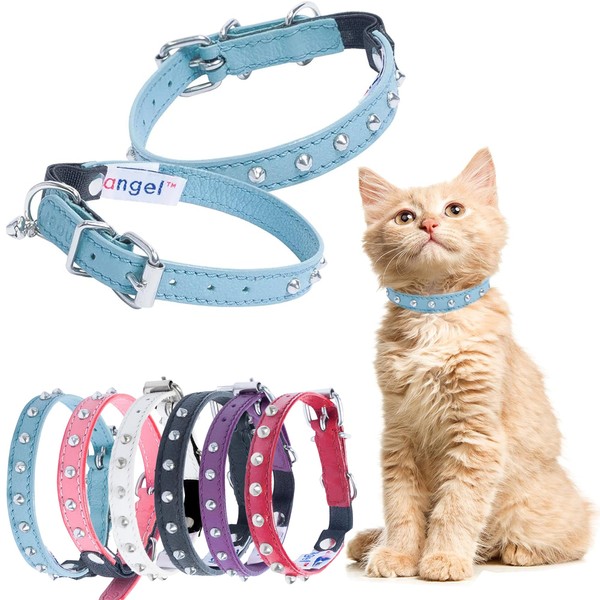 Leather Studded Cat Collar with Safety Breakaway Elastic, 12" x 1/2", Blue. for Neck Size: 9" - 10.75"