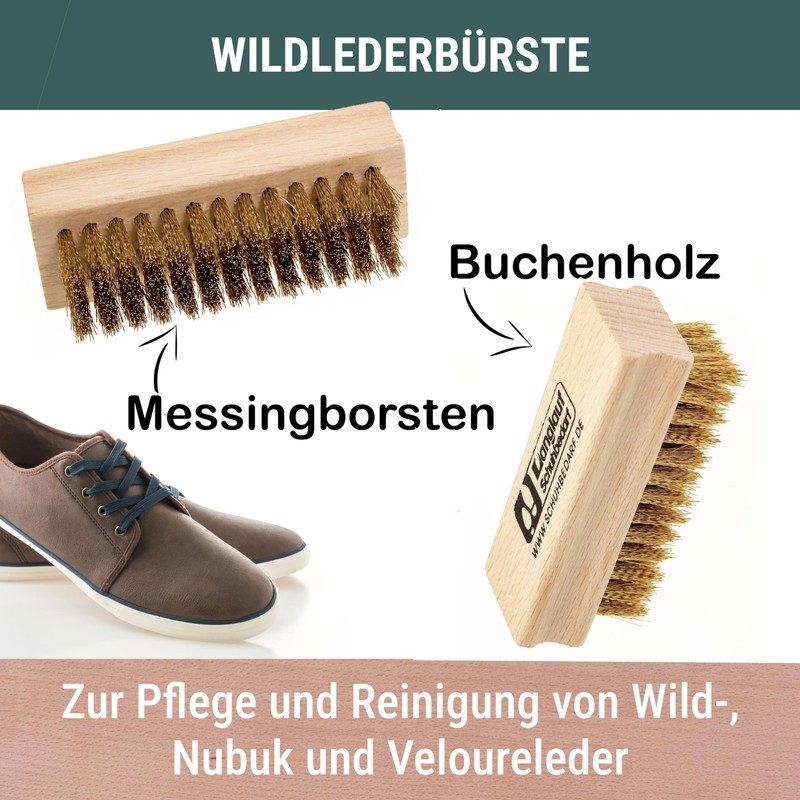 - Premium shoe care with instructions – Immediately clear everything you need for perfect shoe care, including instructions in German. Ideal for suede care shoes, nubuck leather, suede and smooth leather. For professionals & beginners - the shoe brush set that makes your shoes look like new again with Suede Cleaner.
