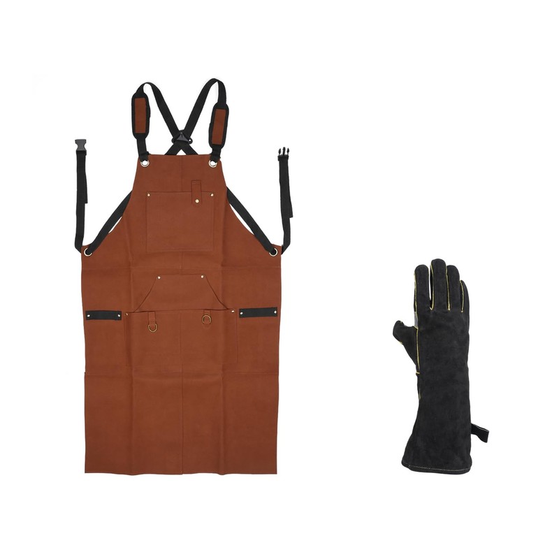 Leather Welding Apron with 10 Pockets, Heat Flame Resistant Aprons with Gloves, Heavy Duty Durable Work Shop Apron