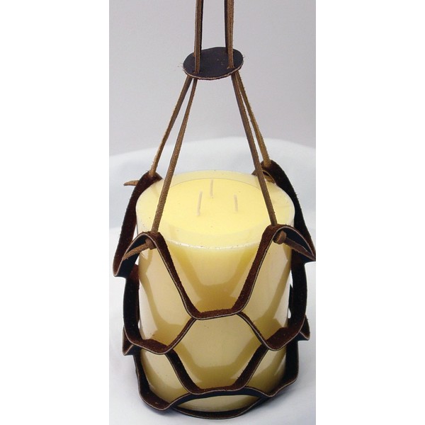 Leather Monkey Sling Hanger can be used for candles or plants. Set includes one each of three sizes: 6.5”, 8” and 9” diameter. Plants or candles not included. This is a kit and needs to be put together. Colors will vary from picture on web.