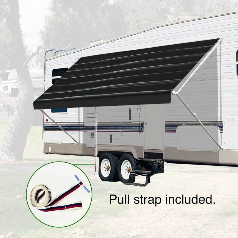 - Innovated RV Awning Replacement Fabric Material - 15oz super heavy vinyl coated high strength twist polyester make the fabric much more strong for tearing resistant; special treatment on camper trailer awning fabric to provide -28 degree COLD CRACK resistant; anti-UV, frame resistant, to match American Standard (ASTM). Leaveshade offers 5 YEARS weathering