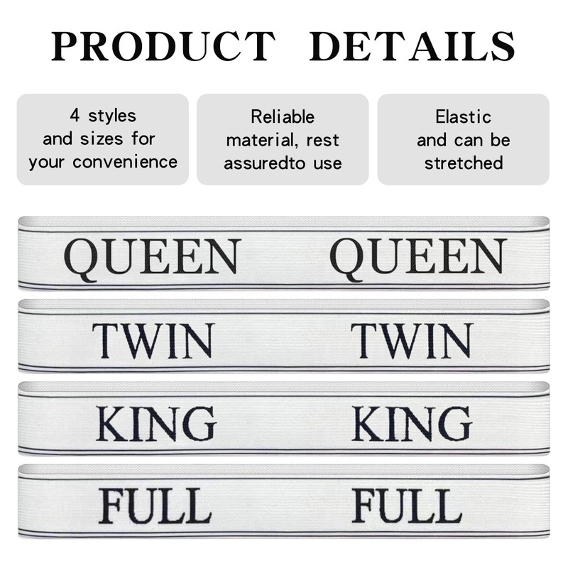 - Package Including: Comes with 8 pieces of bed sheet straps, These bedding bands are printed with KING, QUEEN, TWIN, FULL. When not in use temporarily, it can be easily stored without taking up space at all.