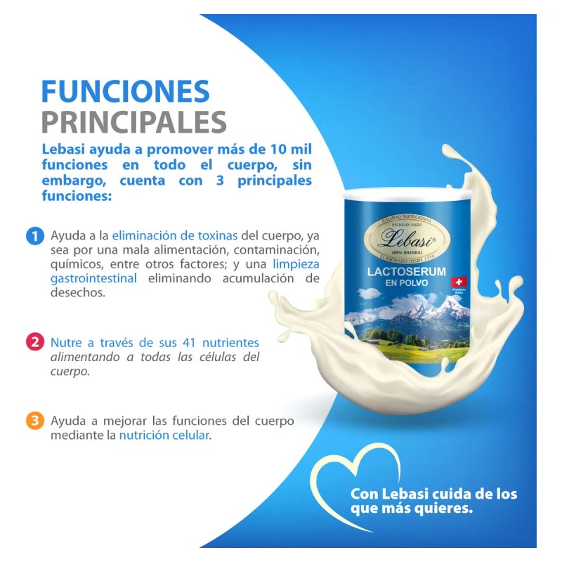 Alimento nutritivo Suizo 100% natural en POLVO. Excelente soporte nutricio para enfermedades crónico degenerativas, contiene 11 Vitaminas 11 Minerales y 19 Aminoácidos, libre de colesterol, conservadores o aditivos. El consumo de Lebasi impacta positivamente la detoxificación del cuerpo al ser precursor del glutatión.