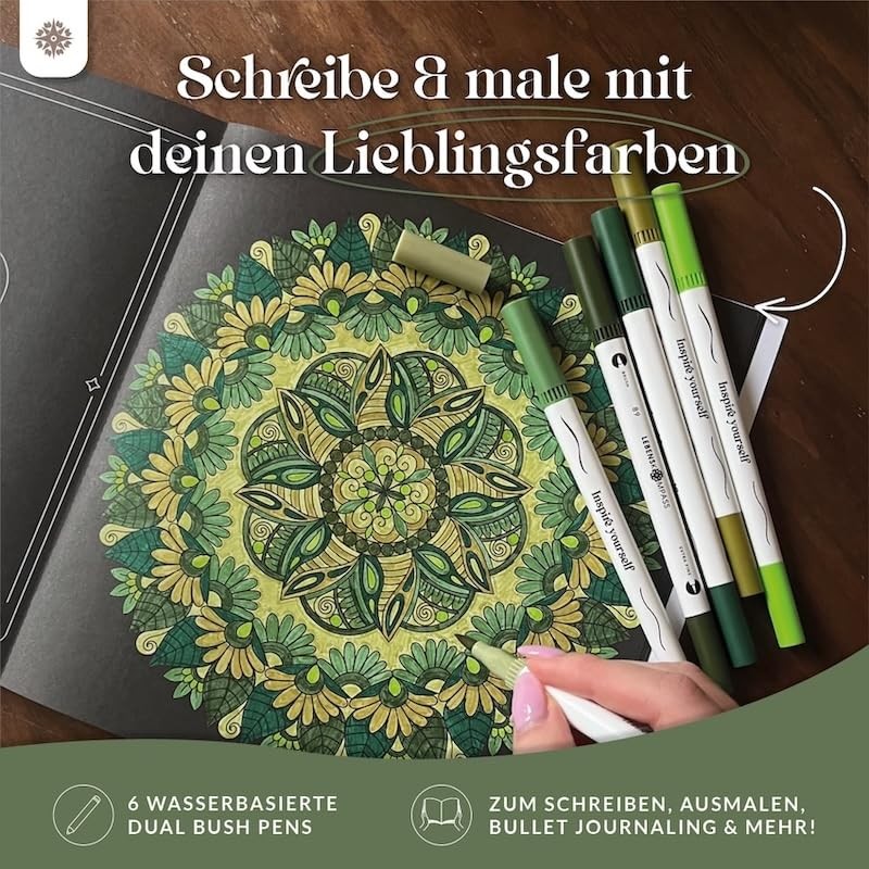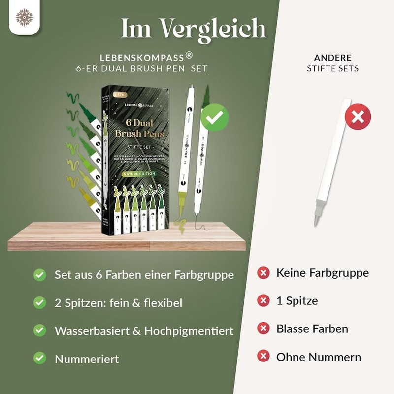 LEBENSKOMPASS® Brush Pen Set Nature - 6 Brush Pens in Green Tones - Brush Pens for Hand Lettering, Colouring & Bullet Journal - Dual Tip Pens with Fine & Flexible Tip