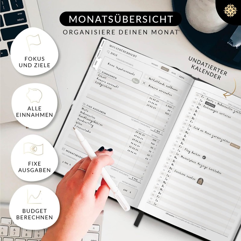 - Monthly financial planning: The monthly budget pages let you set spending categories, create budgets, and track your actual spending. This helps you control your expenses and maximise savings.