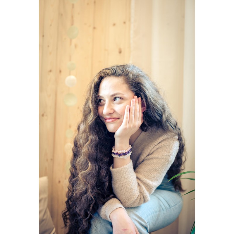 - Set of 3 each consisting of a rock crystal, amethyst and rose quartz chip bracelet. The total length of the bracelet is stretchy and fits your wrist comfortably. The basic size is a generous 19 cm and provides a comfortable fit for most wrists.