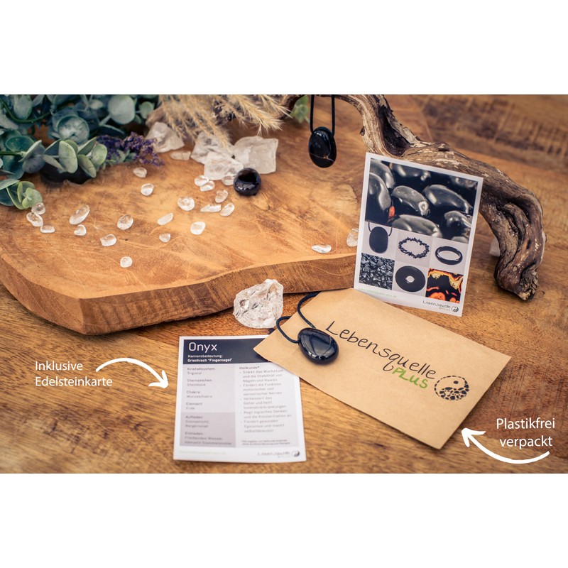 - Includes a gemstone card. A lovingly designed gemstone card for onyx with all useful information about the zodiac sign, chakra and the said healing effects is also included.