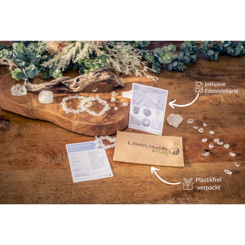 - Includes a gemstone card. A lovingly designed gemstone card for rock crystal with all useful information about the zodiac sign, chakra and the said healing effects is also included.
