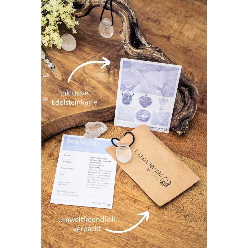 - Includes a gemstone card. A lovingly designed gemstone card for rock crystal with all useful information about the zodiac sign, chakra and the said healing effects is also included.