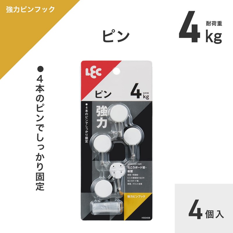 LEC H00408 Strong Pin Hooks, Pack of 4, Load Capacity: 8.8 lbs (4 kg), White