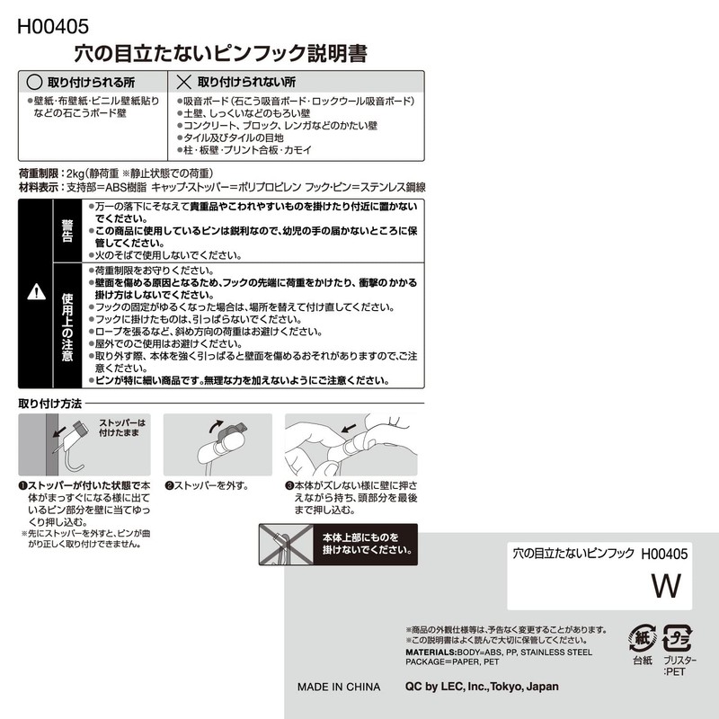 LEC Invisible Hole Pin Hooks, Pack of 3, Load Capacity 4.4 lbs (2 kg), White