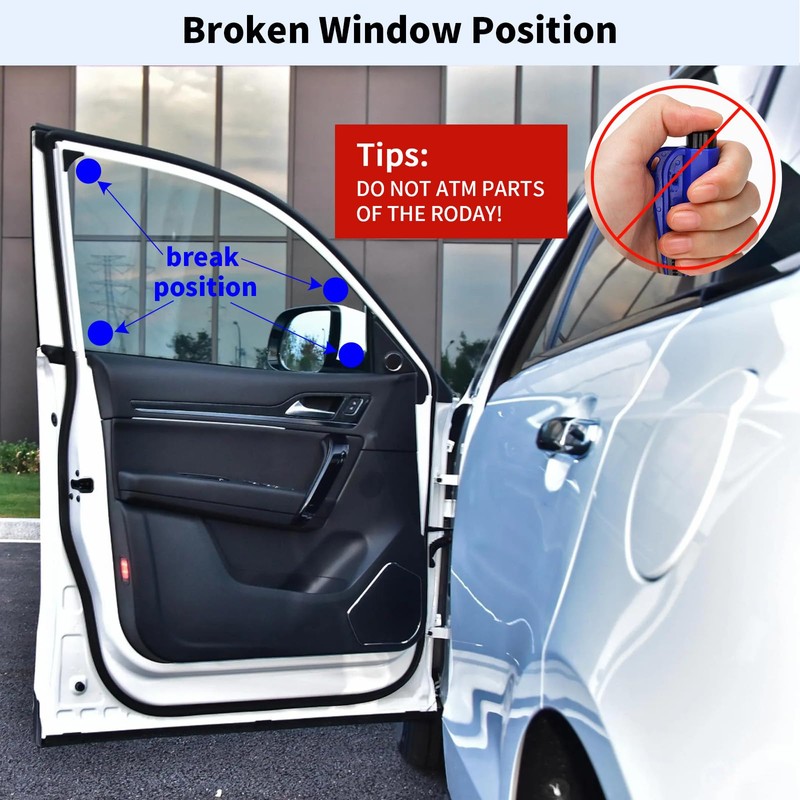 Seat Belt Cutter: Features a concealed, razor-sharp blade that can cut through