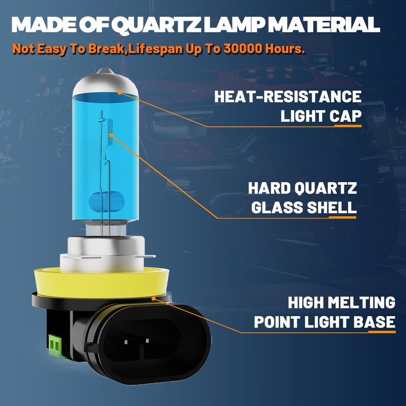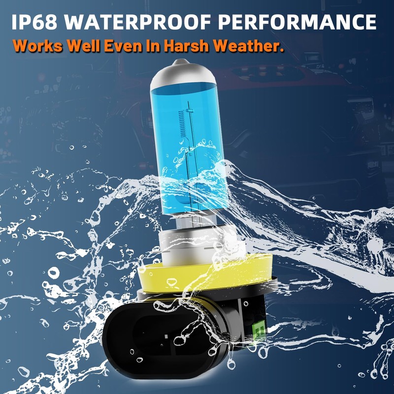 • 【Over 30, 000 Hours Lifespan】The H11/H8/H9 fog light bulb is filhalogen with Xenon gas, which helps helps to slow down the process of oxidizing the tungsten inside.H11 Halogen bulbs lifespan can reach more than 30, 000 hours.With IP68 waterproof dustproof design, our Halogen bulb don't burn out or become damaged even in extreme weather, like fog/rain/overcast etc.