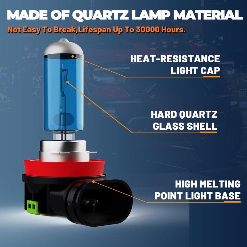 The H11 H11 low and high beam Halogen Bulb is filhalogen with Xenon gas, which helps helps to slow down the process of oxidizing the tungsten inside.The Halogen bulbs lifespan can reach more than 30,000 hours.