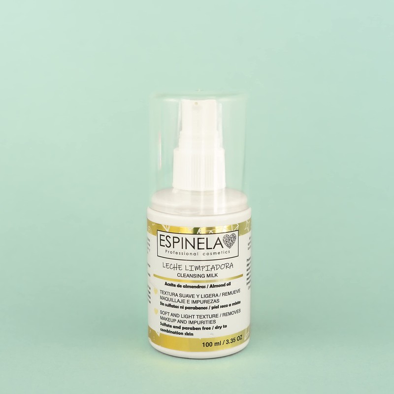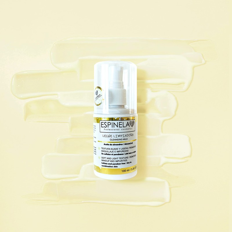 La limpieza diaria es vital para poder lucir una piel saludable y sin imperfecciones, la leche limpiadora remueve de una forma suave las impuresas diarias y el maquillaje a profundidad sin dejar residuos grasos permitiendo asi que los poros respiren y se cumpla la función natural de la regeneración celular. Desmaquilla el rostro, labios, filtros solares de larga duración sin alterar la hidratación de la piel. FORMA DE USO: Aplique la leche limpiadora facial con las yemas de los dedos con movimientos circulares sobre todo el rostro, retire con un algodón o un disco o pad facial. Para uso con agua: aplique directamente sobre la piel húmeda y de un ligero masaje, enjuague con agua y repita la operación. Agua desionizada, tensoactivo ni iónico, agentes emulsificantes, aceite de almendras, lanolina etoxilada, IPP y conservador natural.
