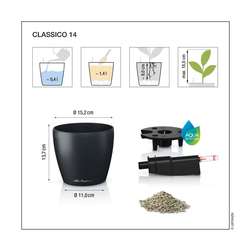 - All-in-one: 1 x Classic Colour planter, including watering system and water level indicator, plant substrate Lechuza-Pon as drainage layer; material: plastic, dimensions: diameter 15.2 x 13.7 cm, plant insert: diameter 15.2 x 13.7 x 14.5 cm, plant volume: 1.4 litres, water storage: 0.38 Large