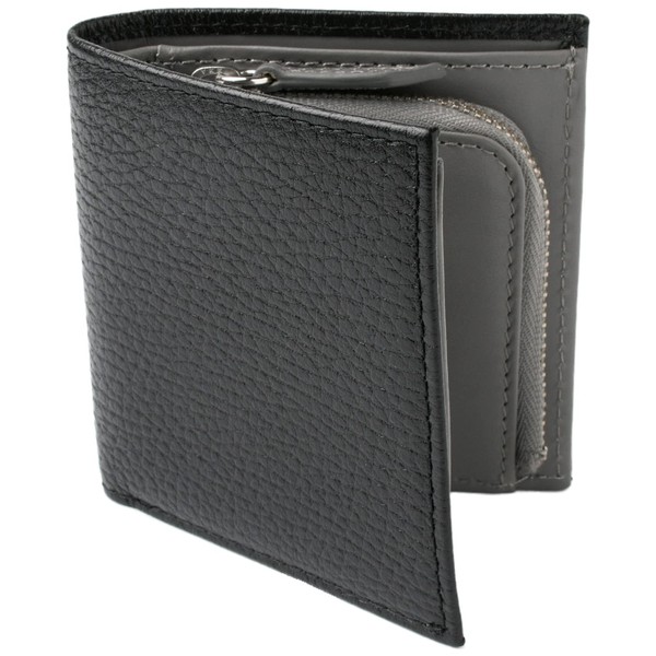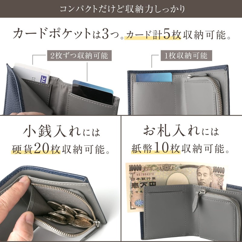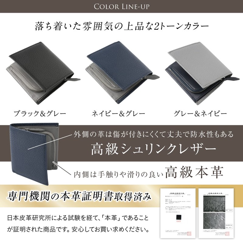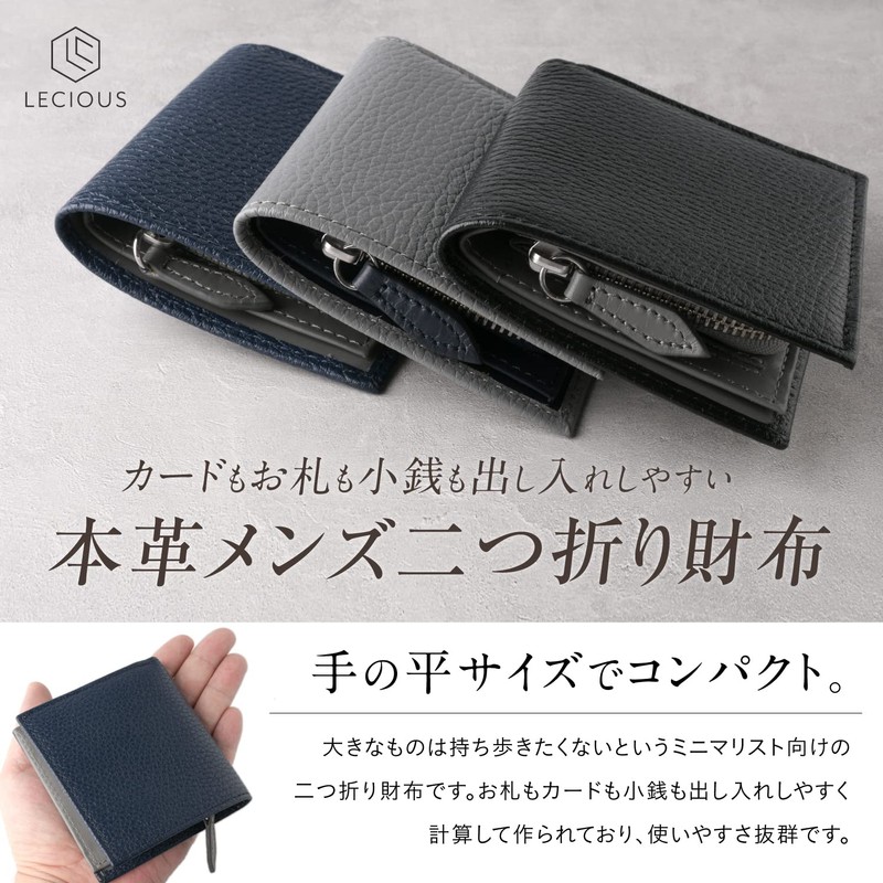 Men's Genuine Leather Bi-Fold Wallet: Compact in the palm of your hand. A minimalist small wallet that you don't want to carry a big one. It is made with calculation to make it easy to insert and remove bills, cards, and coins. It is very easy to use. Premium shrunken leather exterior is scratch-resistant and durable. It is also waterproof. The interior is made of premium genuine leather that is smooth and moisturized. (One side is opened, so you can take out your bills) The side of the bill compartment is opened so that it opens wide without sewing. Allows you to smoothly insert and remove bills. (Card slots that can be removed in the same direction as bills) The 3 card pockets are all designed to be used to remove the cards in the same direction as the bill, making them very easy to use. (L-shaped zipper for easy access to coins) The coin purse uses a wide L-shaped zipper that opens widely. Easy to see inside and make payments smoothly before checkout. Compact but with strong storage: 3 card pockets. 2 pockets to store 2 cards at a time and 1 pocket to store 1 for a total of 5 cards. The coin purse can hold about 20 coins. The bill compartment can hold about 10 bills. 2 Tone Colors with a Muted Atmosphere: 3 color lineup. (1) Exterior: Black, Interior: Gray, (2) Exterior: Navy, Interior: Gray, (3) Exterior: Gray, Interior: Navy. Each color has an elegant and intelligent feel. Genuine Leather Certificate Certified by Professional Institutes: This bi-wallet has been tested by the Japan Leather Laboratories and is proven to be genuine leather. Buy with confidence! LECIOUS is a Japanese brand. We take thorough inspection by Japanese staff, but in the event of a defective product, we will refund and return within 120 days of purchase. Japanese customer support. Product Details: Brand Name: LECIOUS; Material: Cowhide leather; Color: Black & Gray, Navy & Gray, Gray & Navy; Size: 3.7 x 3.4 x 0.8 inches (9.4 x 8.7 x 2 cm); Weight: 1.9 oz (55 g); Zipper: Made of YKK; Specifications: Card pockets x 3, bill compartment x 1, coin purse x 1.