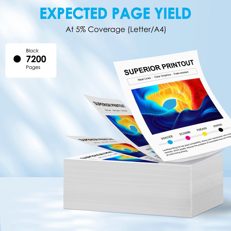 - High Page Yield: 7,200 pages per Black,, at 5 percent Coverage of A4 letter.