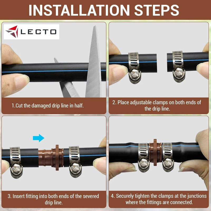 LECTO Universal 5/8", 1/2", .700" Drip Line Repair & Extension Kit – Plastic Coupler with 2 Stainless Steel Hose Clamps
