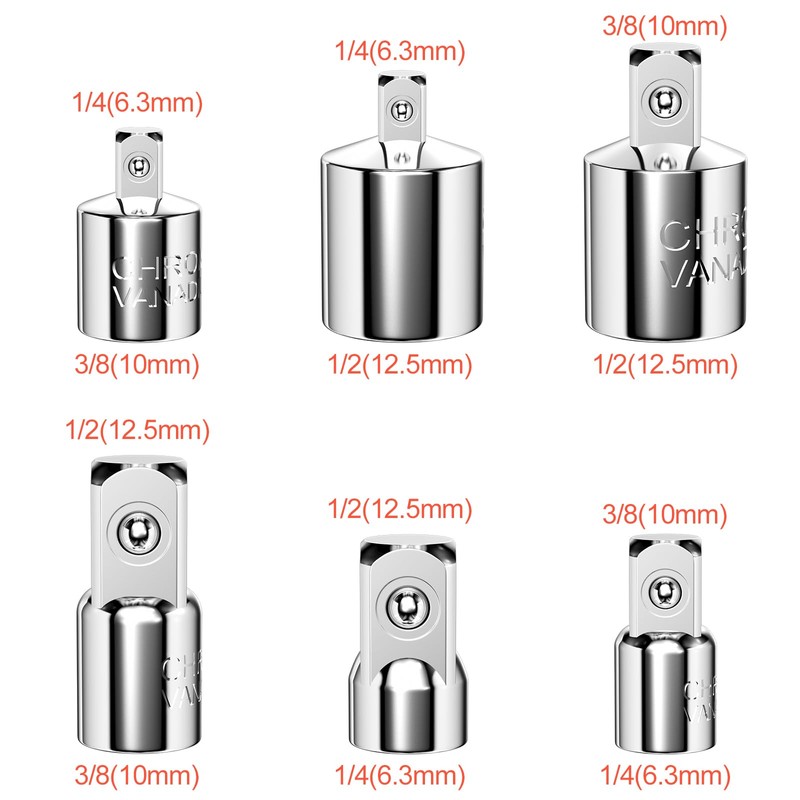 - Multiple sizes: There are 6 adapters in total. 1/4 hole on 3/8 head, 1/2 hole on 3/8 head, 3/8 hole on 1/4 head, 3/8 hole on 1/2 head, 1/2 hole on 1/4 head, 1/4 hole to 1/2 head. Allows you to easily switch between 1/2, 1/4 and 3/8 sockets.