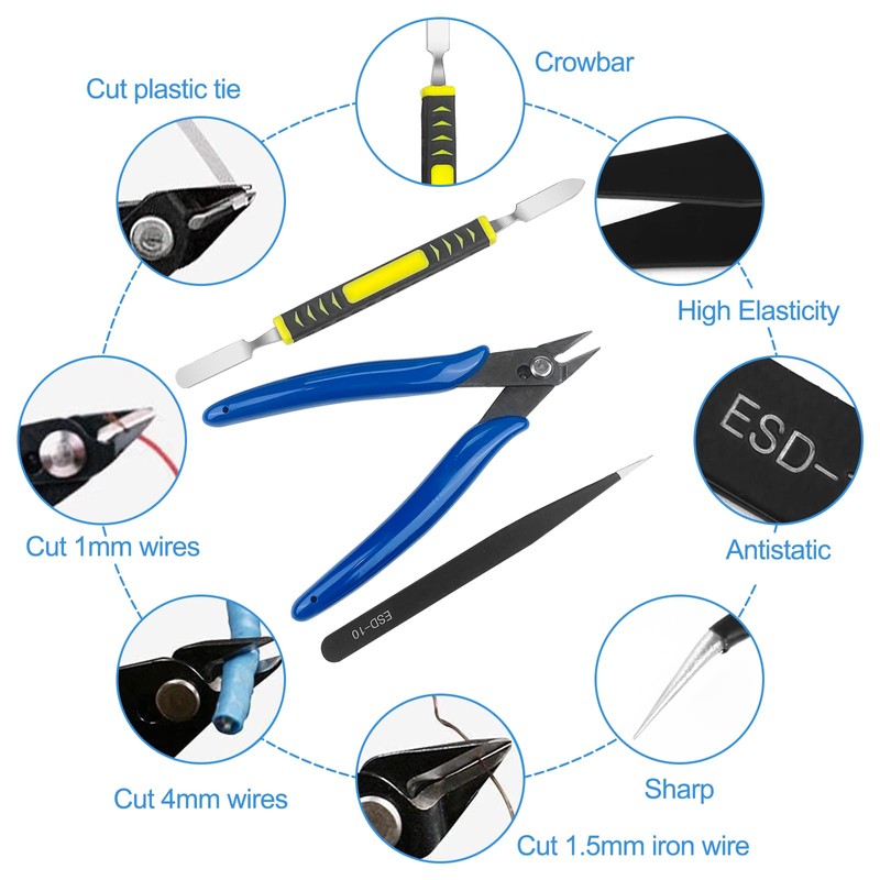 - Wide range of applications: the multifunctional tweezers are ideal for electronics, watch repair, crafts, laboratory work, etc. The cutting pliers can be used for cutting plastics, flower arrangements, soft copper wire, small metal wires, etc. Suitable for use.