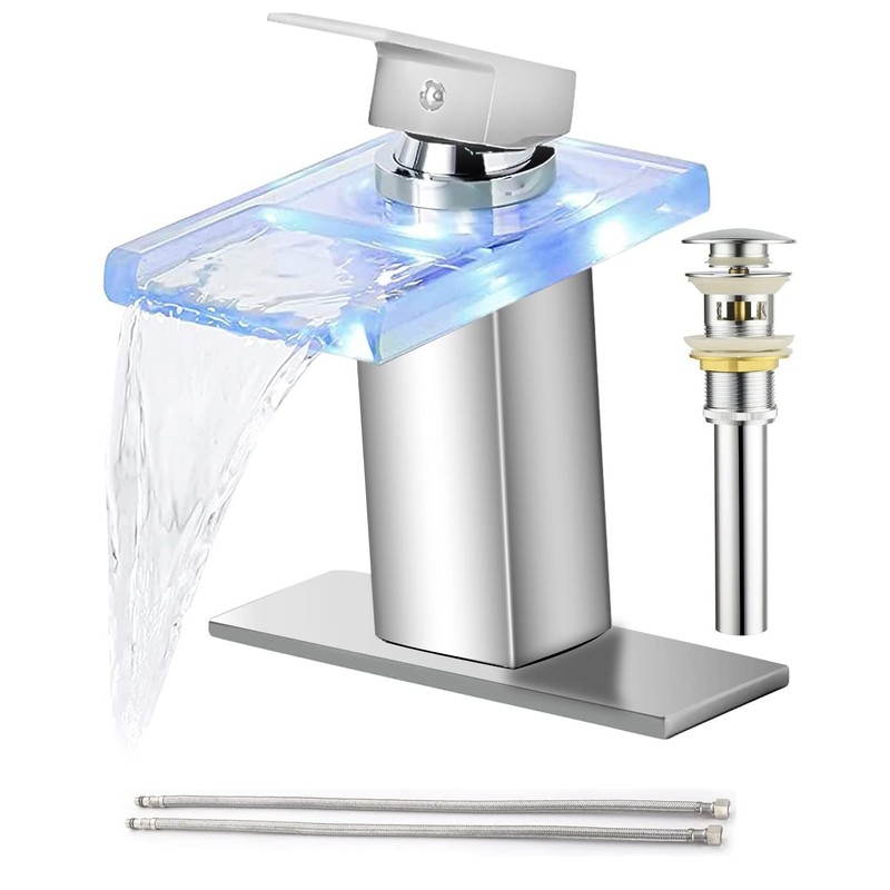 LED Bathroom Sink Faucet, Waterfall Single Handle Vanity Faucets for Sinks 1 or 3 Holes with Metal Pop Up Drain and 2 Water Supply Lines, Open Glass Spout by Bath Famoli (Chrome)