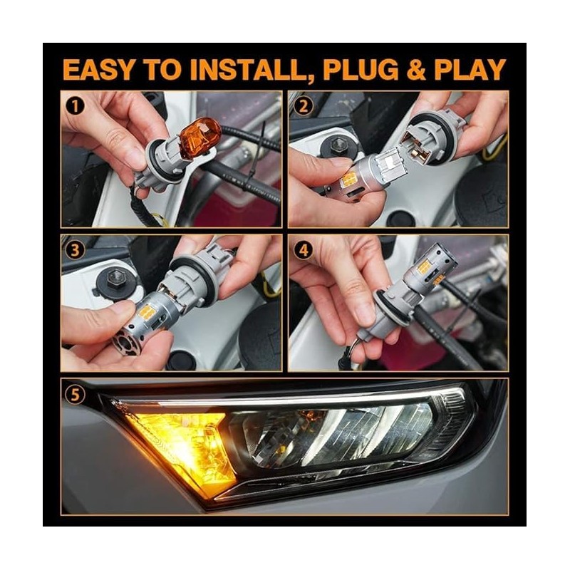 This option is for the Turn Signal T20 only. Sales Unit: 2 pieces Chip Type: 24 high-brightness CSP 1919 SMD LEDs, 6 on each of the 4 sides Base Specifications: T20 7440 single core / 1156 single core Color: OEM Amber Warranty Period: 12 months