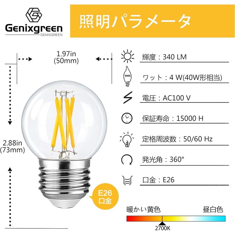LED Bulbs, E26 Base, 4W (40W Equivalent), G50, 2700K, Filament Bulbs, Chandeliers, Edison Bulbs, Dimmable, Clear Bulbs, Pack of 6, PSE Certified