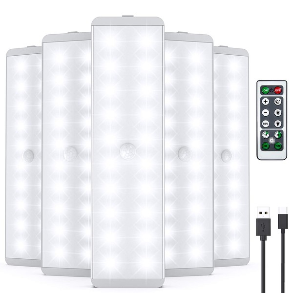 LED Closet Light, Newest 20LEDs Dimmer USB Rechargeable Motion Sensor Light Under Cabinet Lighting with Remote Control, Wireless Stick-Anywhere Night Safe Light Bar for Wardrobe,Kitchen-5 Pcs