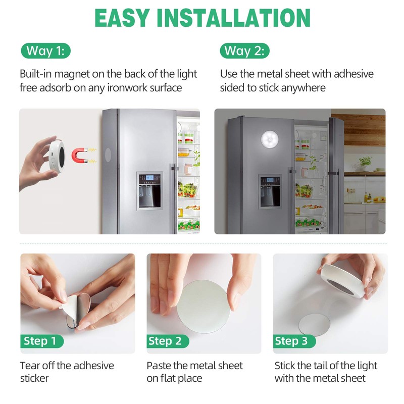 - 【 Built-in Magnet and Easy to Install/Take Down】-- The rechargeable puck light is convenient to install in seconds! It has 2 installation ways. ① Directly attach to any ironwork surface with the Built-in Magnet. ② Use the metal sheet to stick on any flat surface, using the back of the lamp to adsorbed on the metal sheet, and easily can be removed to use or charge right away. You can put the led cabinet lights wherever you want. No hammers, drills, or tools required, easy to install and remove.