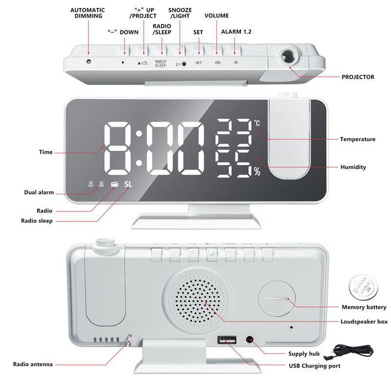 1、High-definition projection clock and 180 adjustable angle: two-level projection brightness adjustment and degree display direction adjustment, 5m high-definition projection, no need to manually adjust the focal length. 2、 Large screen and adjustable brightness: 8-inch large screen borderless LED and stylish curved design provide you with the ultimate visual experience. You can adjust 4 projection brightness and 4 screen brightness as needed. 3、 Dual alarm with resounding: With dual alarm settings, you can set the drip and radio alarm modes, and wake up via your favorite radio or ringtone at the required time. With high-quality 4 ohm 3 watt speakers and professional power amplifier circuit design, the sound can be perfectly released. The dual alarm clock with snooze button allows you to snooze for 5 to 60 minutes. 4、 FM radio and timer function: The signal reception range of this FM projection alarm is 76-108.0MHz, and the antenna on the back of the unit can be extended to obtain better reception. You can register up to 15 sites for quick and easy access. The timer function allows it to automatically turn off after standby. 5、 Backup battery and USB charging: Main power for radio, alarm and time display functions, battery (included) to ensure that all settings can be stored in the event of a power failure. The 5V/1.2A USB output on the back of the clock allows you to charge your compatible for iPhone, Android smartphones and tablets. 6、 Operation: 7、 How to open Insert one end of the Micro cable into the Micro charging port of the product and the other end into the adapter. Then plug the adapter into the power source and issue an alert to start the service. USB mobile phone charger Connect one end of the USB charging cable to the product and the other end to the device (such as a smartphone).