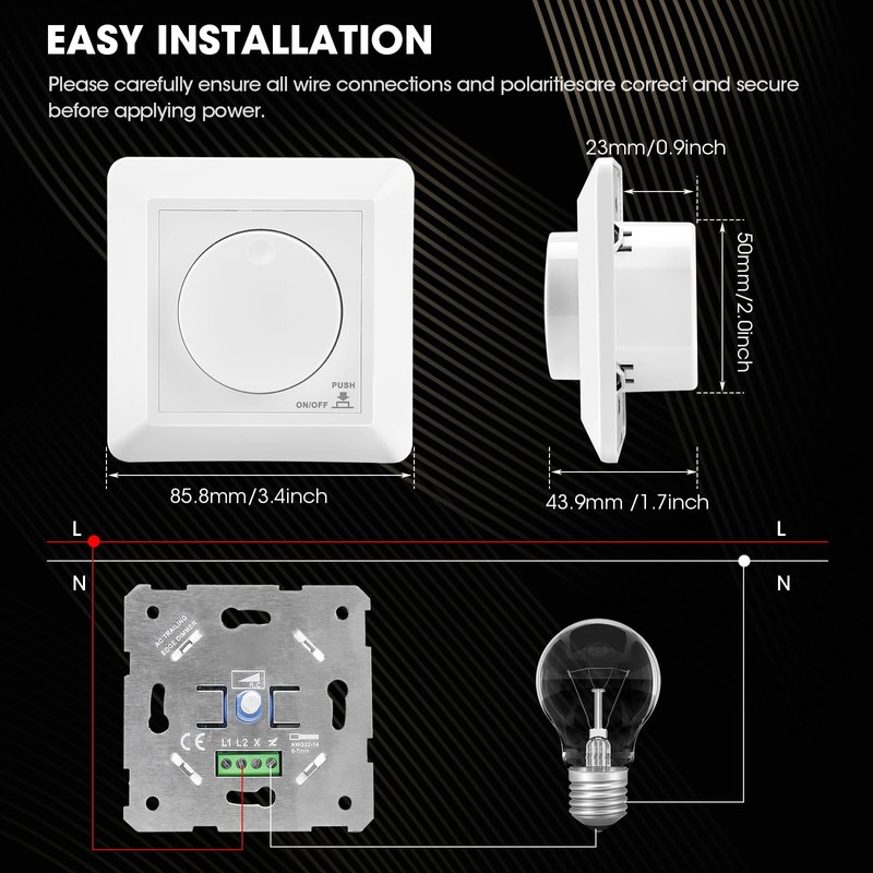 - Universal compatibility: works with dimmable LED, halogen and incandescent bulbs on the market. Set the optimal dimming range for different lamps with the initial brightness controller.