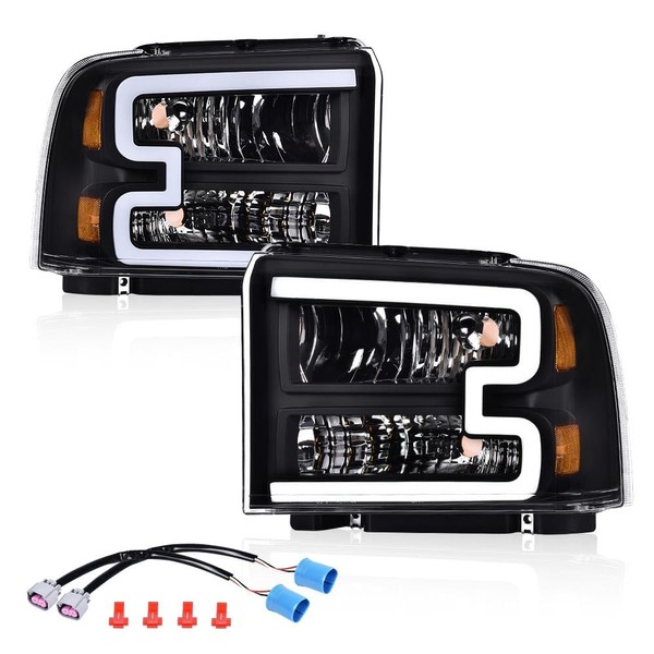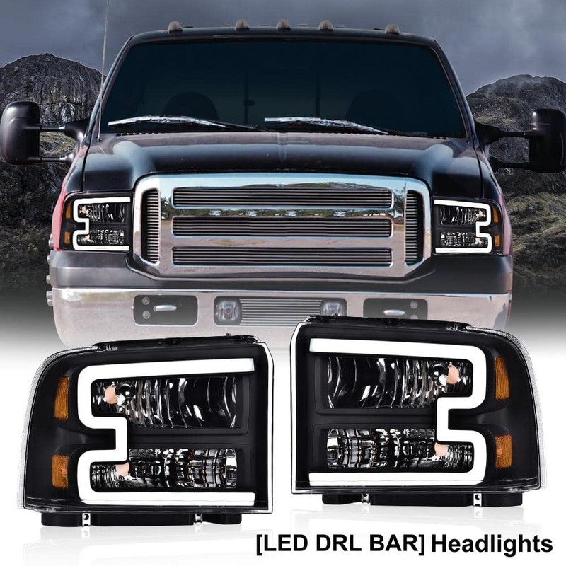 LED DRL Headlight Assembly w/Harness Compatible with Ford F250 F350 F450 F550 Super Duty 2005-2007, Fit Ford Excursion 2005, Front Headlamp, Clear Lens Black Housing Amber Reflector