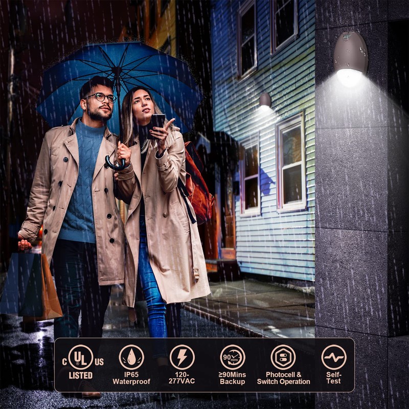 - 💡【Die-Casting Aluminum Housing&Durable Backup】The exterior emergency wall light fixtures made of die cast aluminum housing with the durable dark bronze powder-coated finish deliver a professional look. The housing is sealed and gasketed for even better protection,suitable for wet locations, up to 50,000 hours rated life. Specifications: 120V-277V universal voltage, Photocell & Wall Switch Operation, Self-diagnostics,Backup Battery,Test switch and indicator.