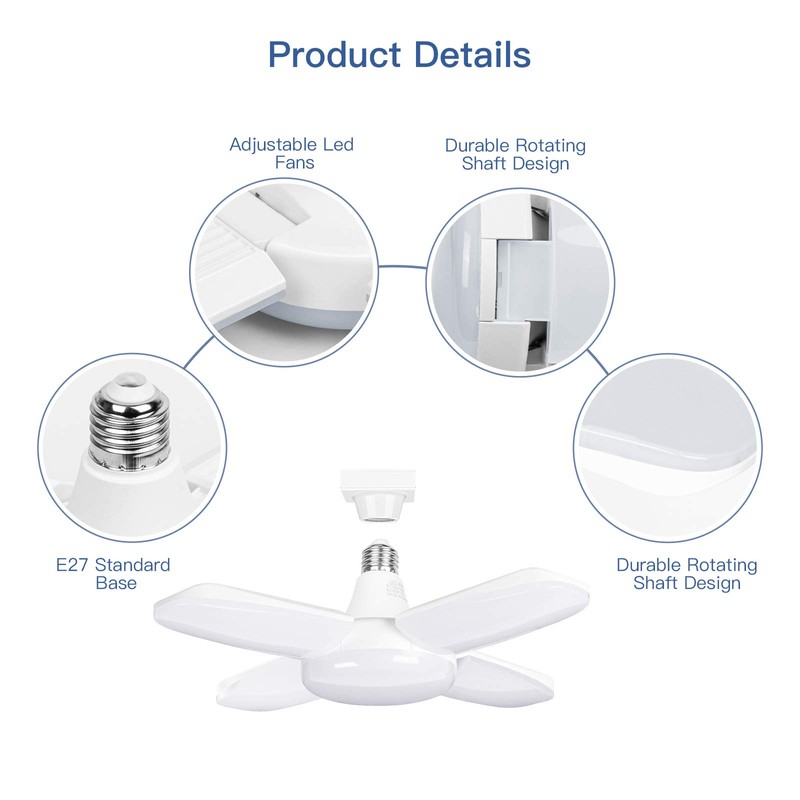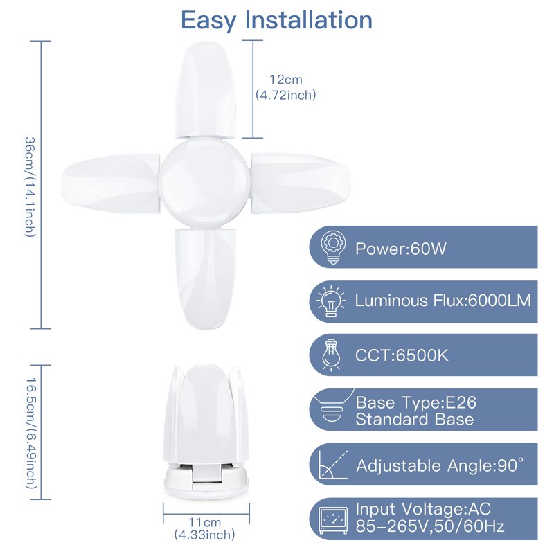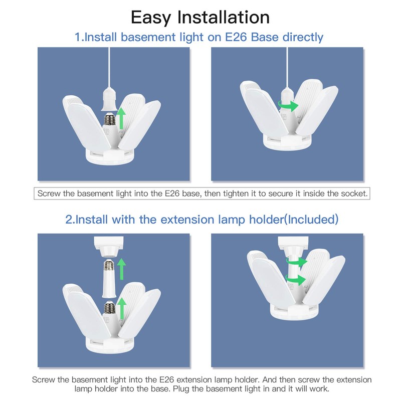 - đăEasy To InstallăGarage Light is compatible with the E26/E27 lamp socket, the Deformable Garage LED Light is simple and convenient to install. No tools, no wiring and no professional electricians are needed, installation is as easy as screwing in a Light Bulb. It is very practical and saves time. We strive to make your life easier. Note: Please turn off the power before installation.