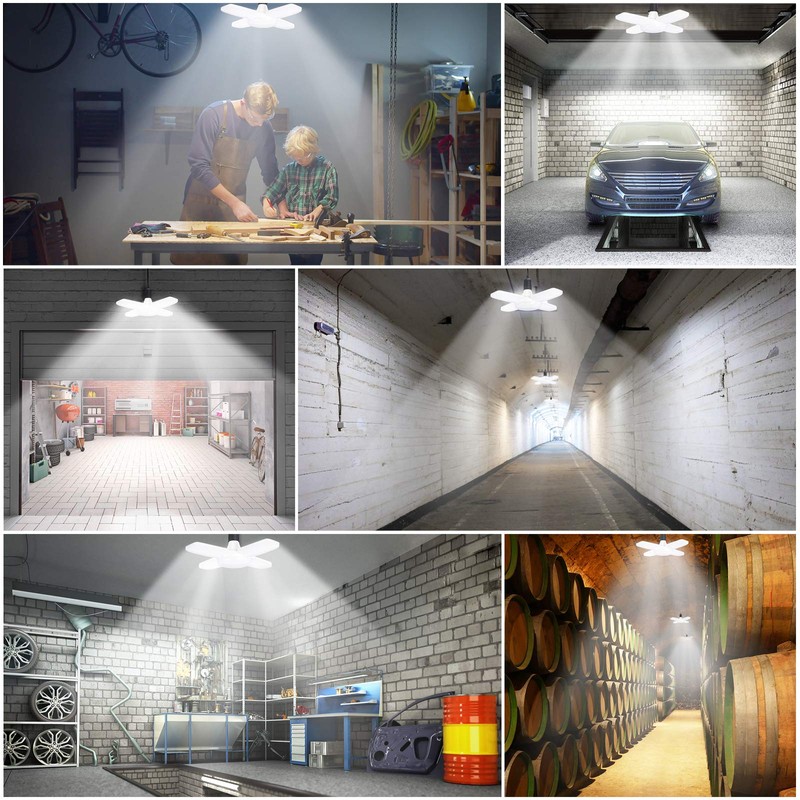- đăHigh Bright Led LightsăLed Garage Lights with 4 adjustable light heads and 1 center light head, full coverage, no dark area. LED Garage Bulbs provide the best indoor lighting experience. Garage Lights for each illumination unit could be adjusted by 90 degrees so that the illumination angle and area can be adjusted at your request.
