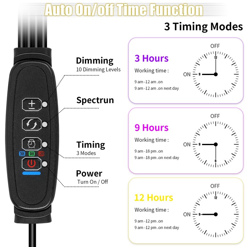 - 【Timing Function】 : Grow lights have cyclic memory timing function, the product will automatically open and close, you can set 3 hours, 6 hours, 12 hours, do not need manual operation, can take better care of the plant.