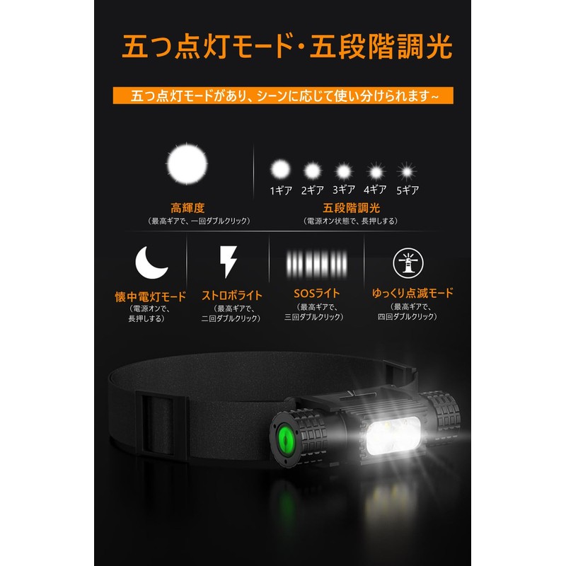 LED Headlight, High Brightness, Headlamp, USB Rechargeable, Compact, 2,200 mAh, 5 Lighting Modes, 5 Lighting Modes, 5 Level Dimming, IP66 Waterproof, 180° Adjustable, Night Fishing, Disaster