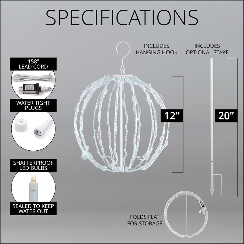 LED Light Ball Indoor-Outdoor Christmas Hanging Tree Globe Light Sphere, Fold Flat Metal Frame (12", White Frame/Green String Lights)