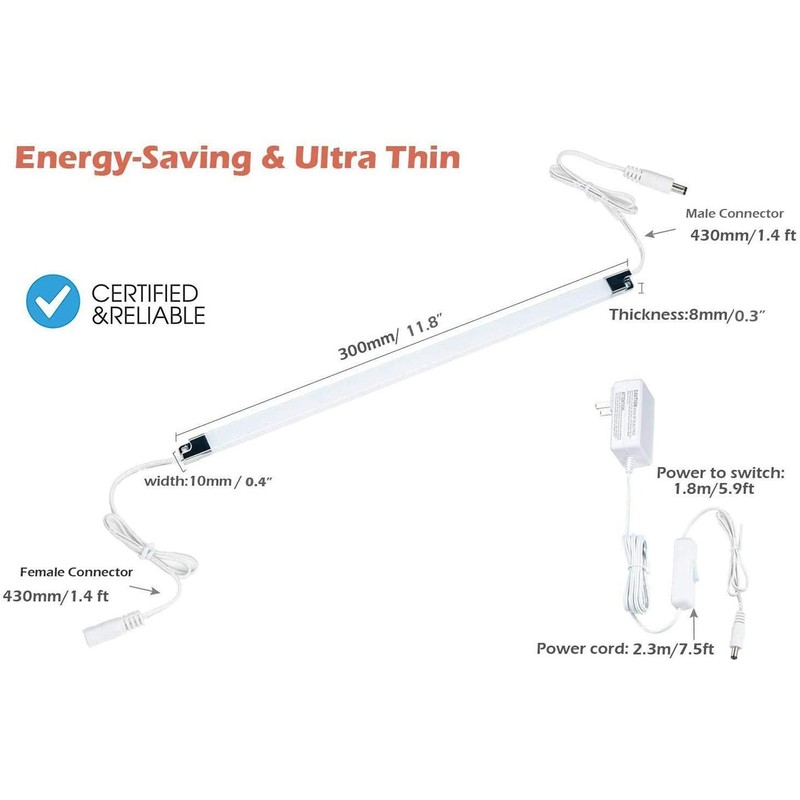 - Cool White (6000K) LED Strip Lights Kit : (6) 12’’ LED light bars + rocker switch+ UL-Listed A/C Power adapter . Per light bar costs only 1.2 Watt, 18pcs High intensity SMD, 120 lumens output