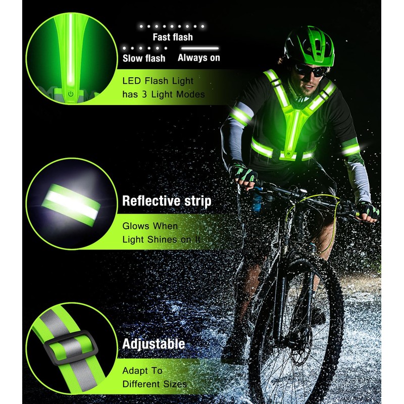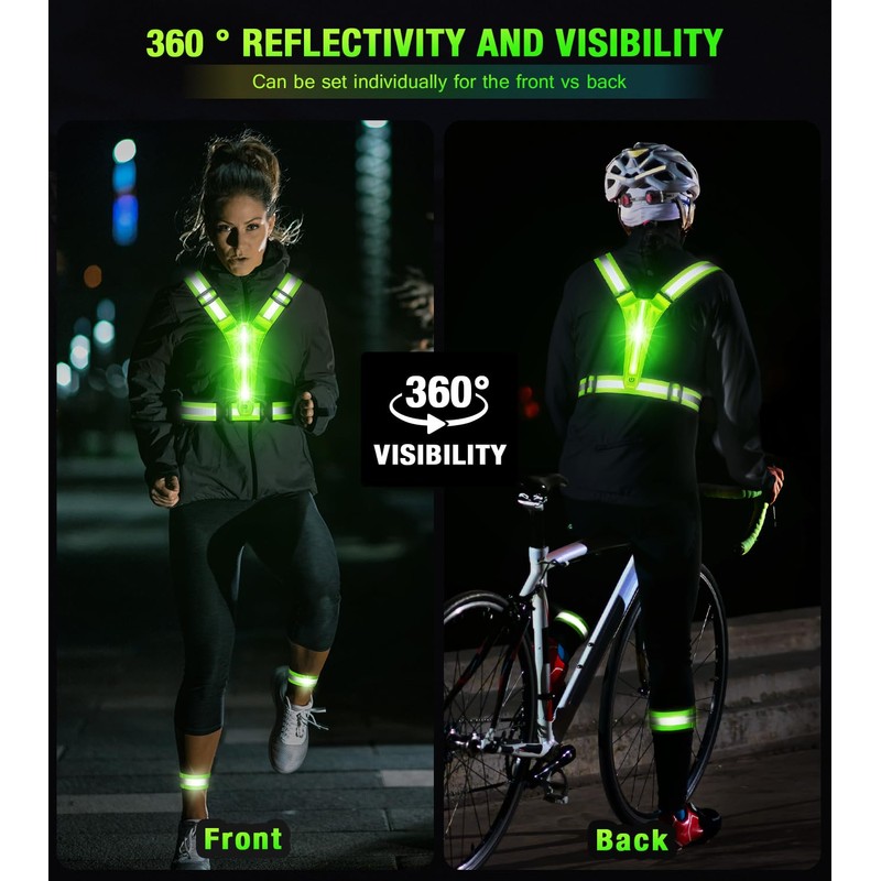 - Brighter and Safer - An innovative LED reflective running vest combines LED flash light and reflective gear for brighter, more eye-catching performance. Keep you safe while running, cycling, walking, motorcycling and etc.