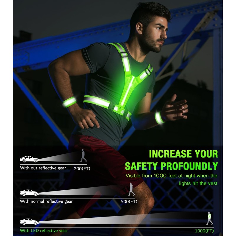 - High-Visible Light Vest – No worries in the dark environment without light reflection. This LED reflective running vest has 20 times higher visibility than ordinary reflective vests, supporting the 1000 feet away visibility.