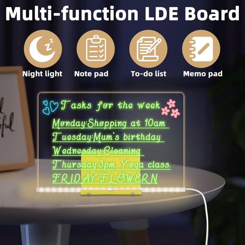 - Drawing & Lighting LED Note Board: This LED note acrylic board combines a clear acrylic dry erase surface with a glowing display, working as both a memo pad and a mood light. Use LED drawing board to doodle, write notes, or add ambiance to bedrooms, cafes, or classrooms.