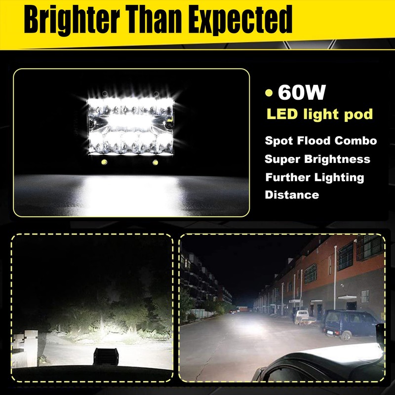 - [BRIGHTNESS]:Our Pod lights build-in 20 PCS high intensity 3W LED,high-quality Led chips and clear PC lens,this LED pod emits 6000k pure white light,achieving lighting effects of 60W/12000LM,effectively light up the dark road during night.